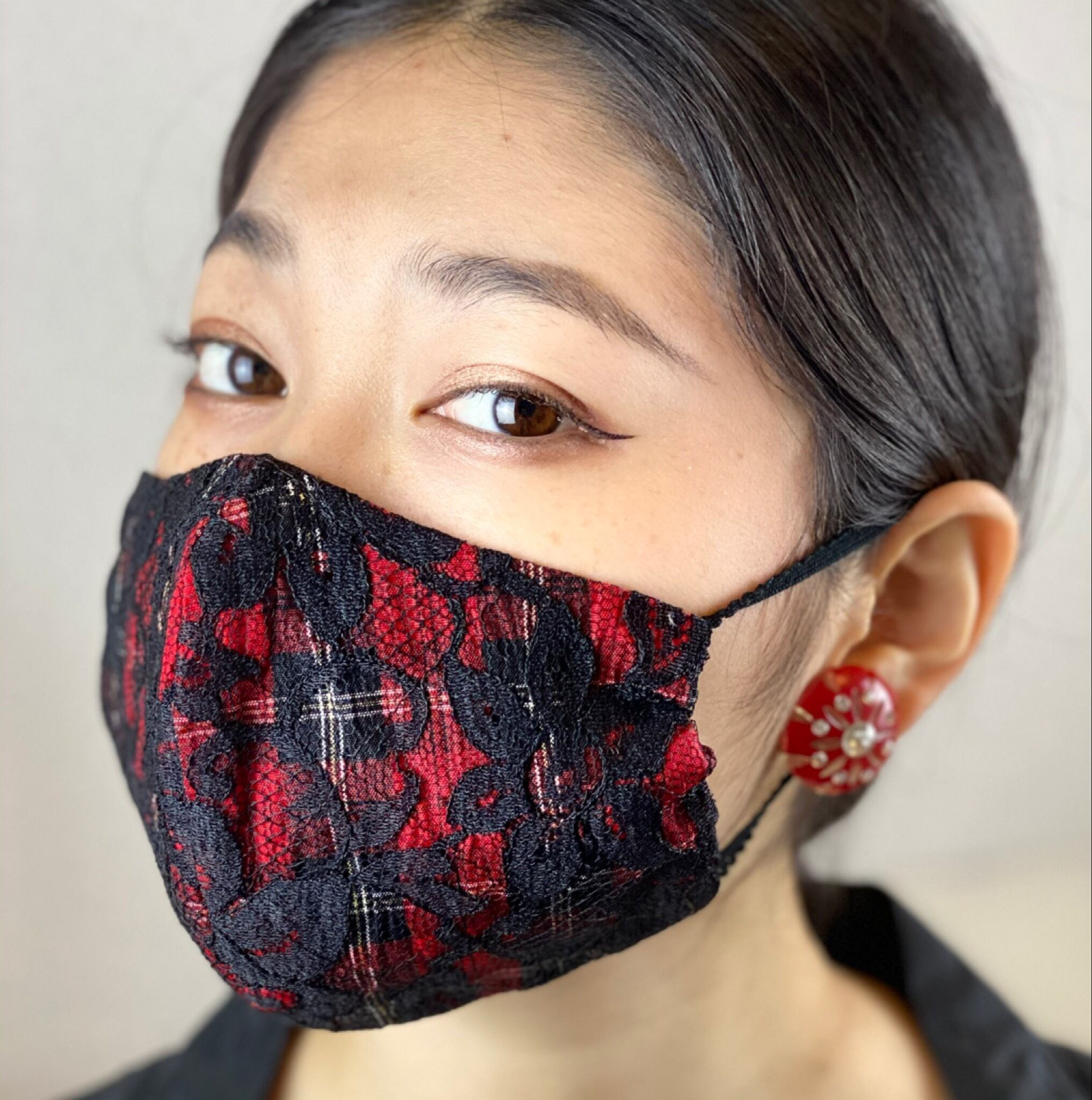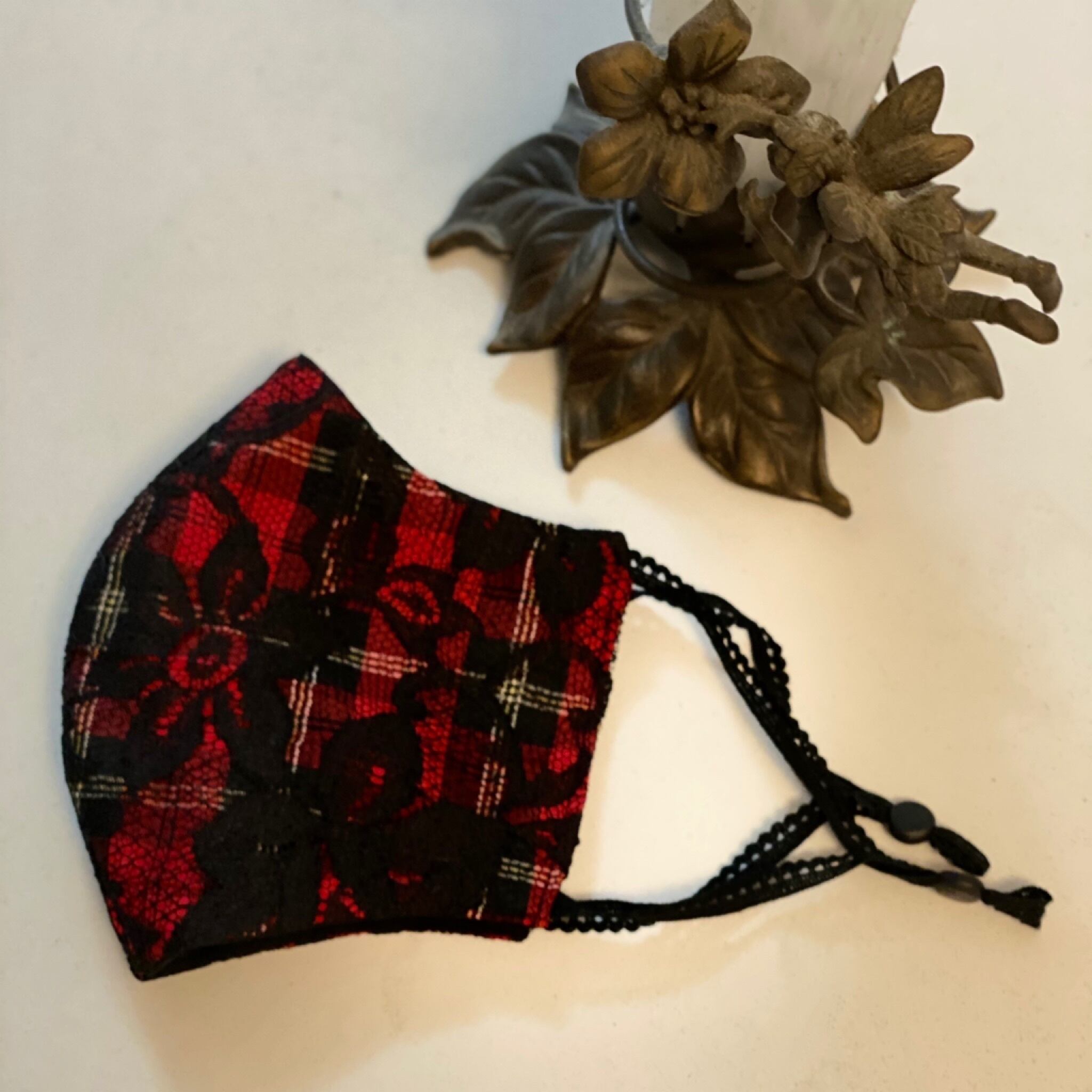 1950年代のタータンチェックのタフタとブラックチュールレースのオーバーラップ生地で作ったマスクカバーです。